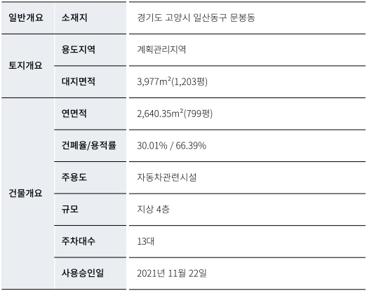 해당 자산은 상용차 정비시설로 사용된 이력이 있으며, 넓은 부지로 인해 대형 차량의 진출입이 용이합니다. 상용차 정비시설로 사용했었기 때문에 덤프트럭이나 대형 버스도 들어갈 수 있을 커다란 오버헤드 도어가 여러개 설치되어있으며 1층(공부상 2층) 정비소 내부 층고가 높아 물류시설로 전환 시 하이랙 사용이 가능합니다. 지하(공부상 1층)에는 부속물품 창고, 사무실, 탈의실, 샤워실 등 편의 시설이 완벽하게 갖추어져 있어 근로자들이 편리하게 이용할 수 있습니다.