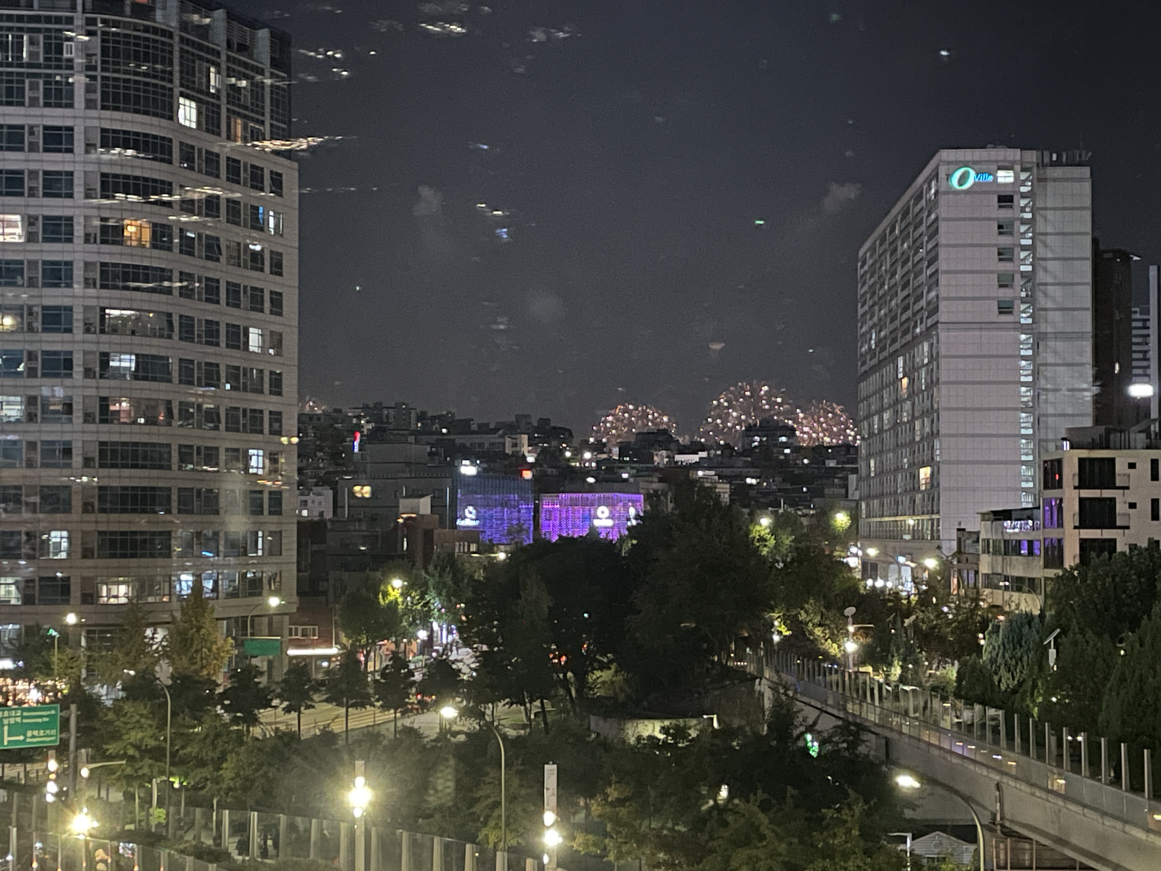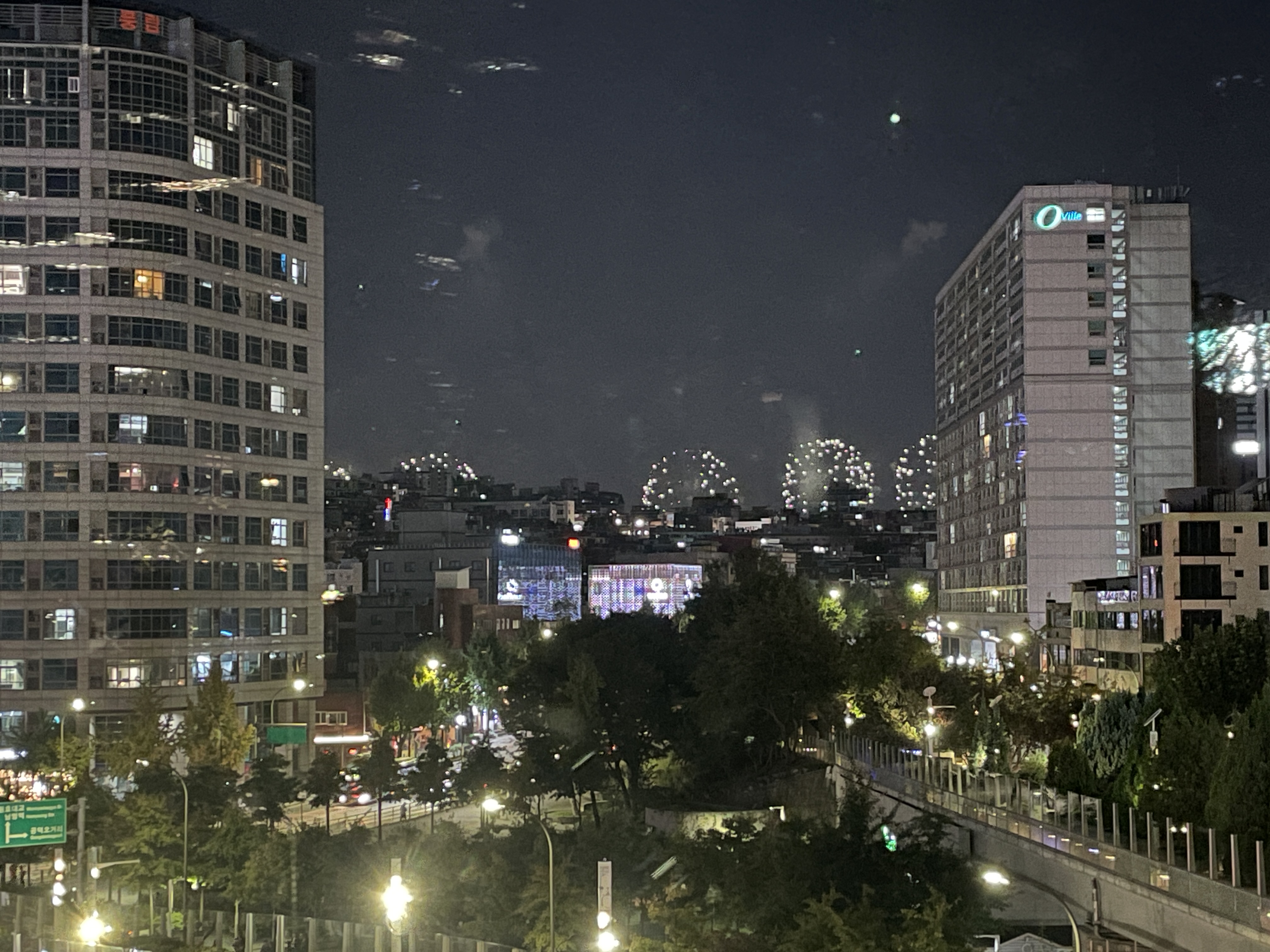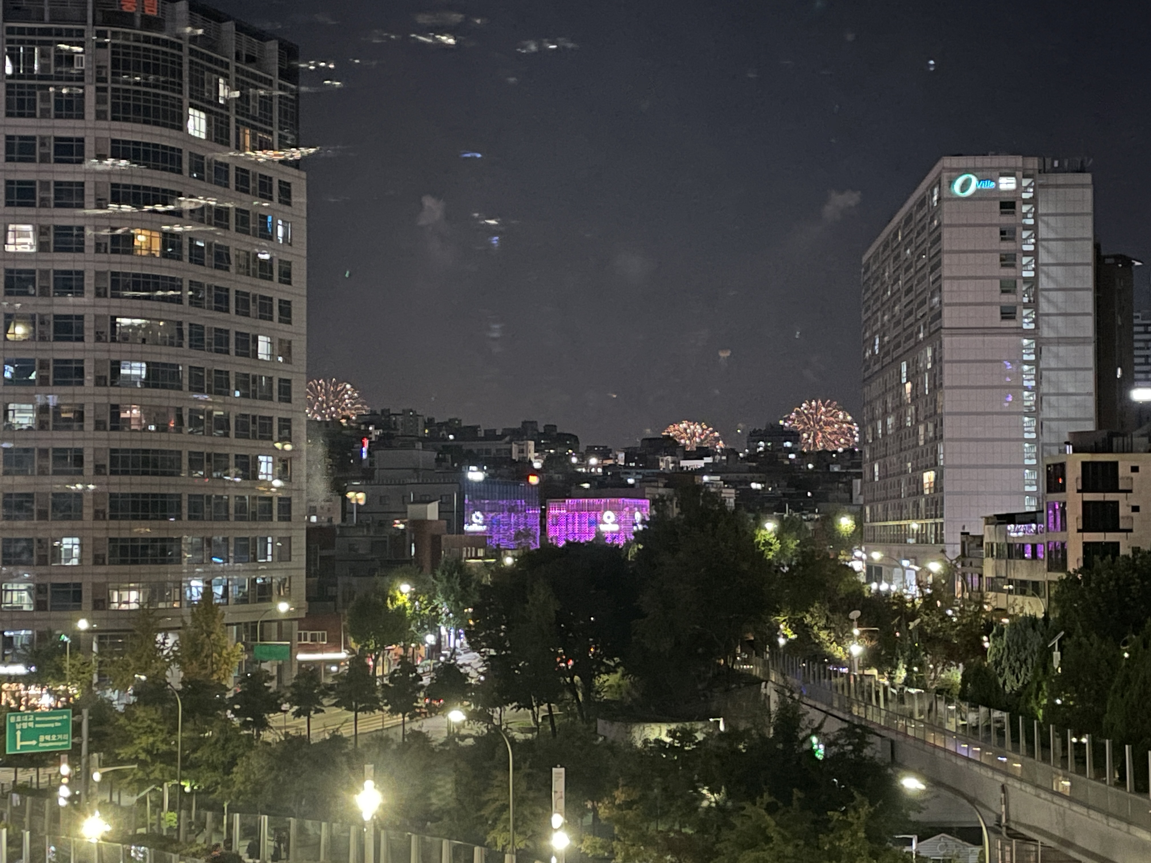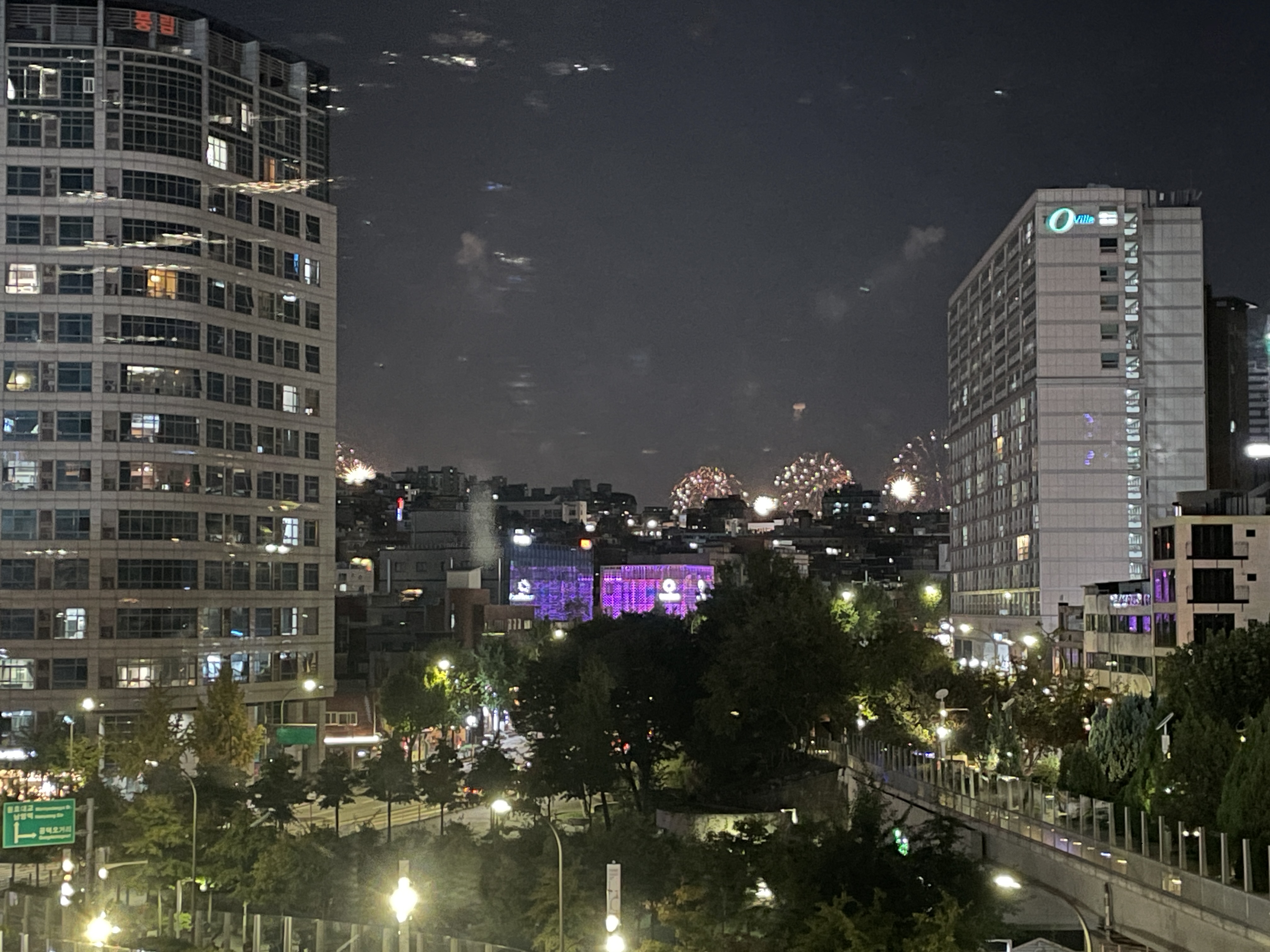 여의도에서 열리는 불꽃놀이를 멀리 떨어진 서울로 7017에서 완벽히 볼 수 있는 것은 아닙니다. 높게 쏘아올린 불꽃들만 간간히 보이는 정도였지만, 그럼에도 불구하고 하늘에 흩어지는 불꽃들의 아름다움은 충분히 느낄 수 있었습니다. 어짜피 휴대폰으로 유튜브 생중계를 함께 보고 있었기 때문에, 전체적인 장면을 놓치지 않고 즐길 수 있었습니다. 현장에서 느껴지는 생동감과 화면을 통해 보는 전체적인 축제 분위기가 어우러져, 나름대로 만족스러운 관람이었습니다.