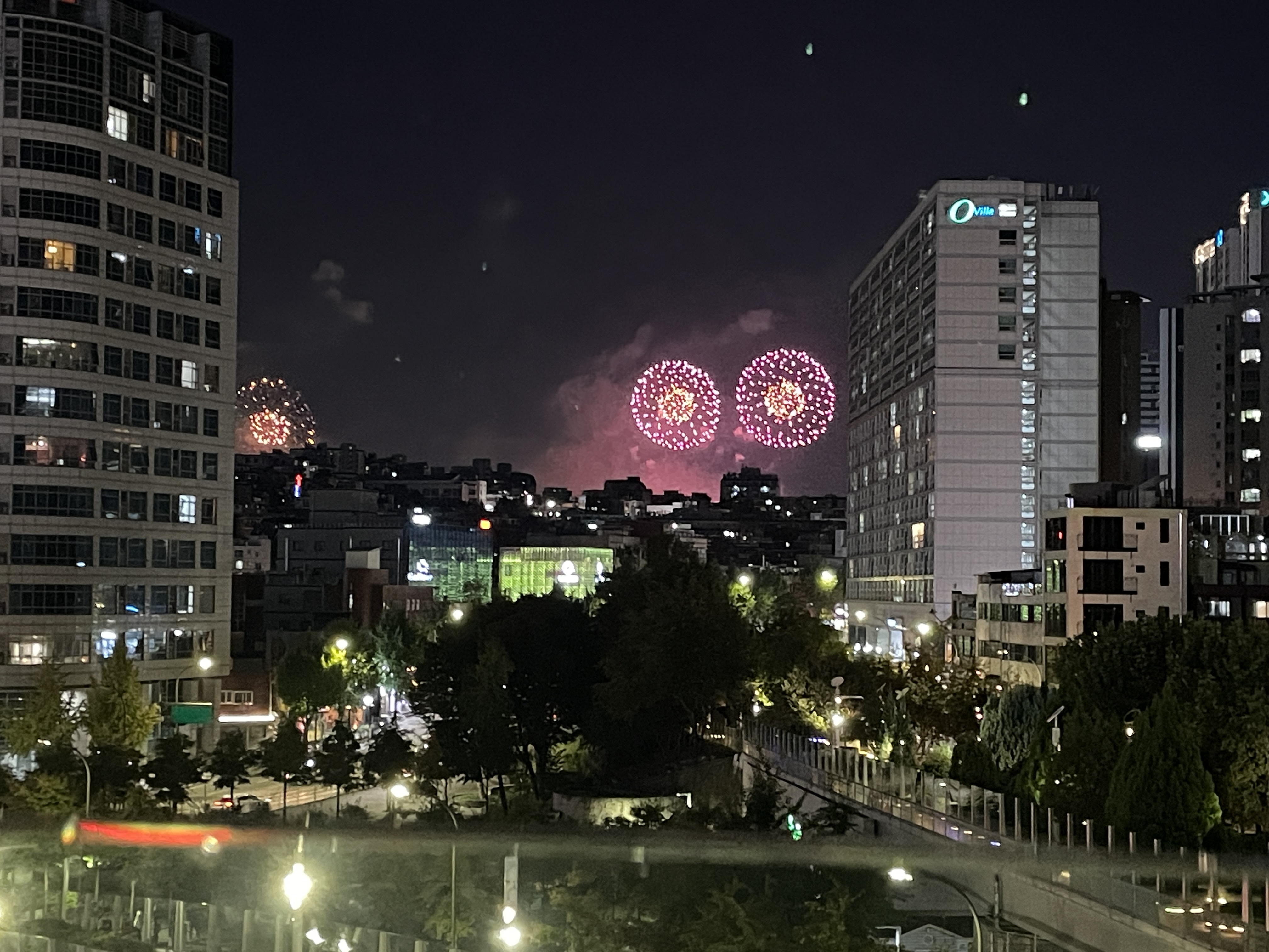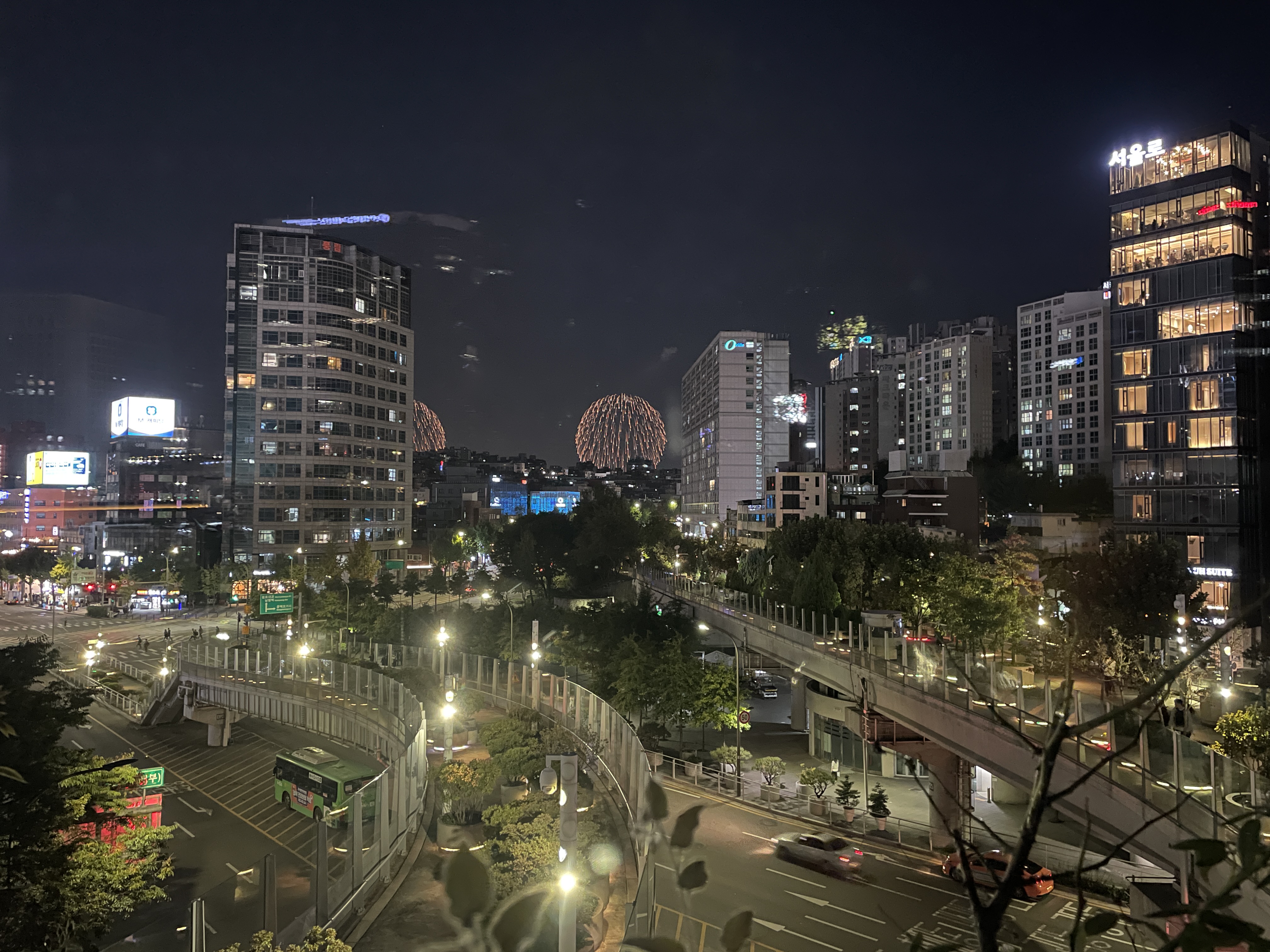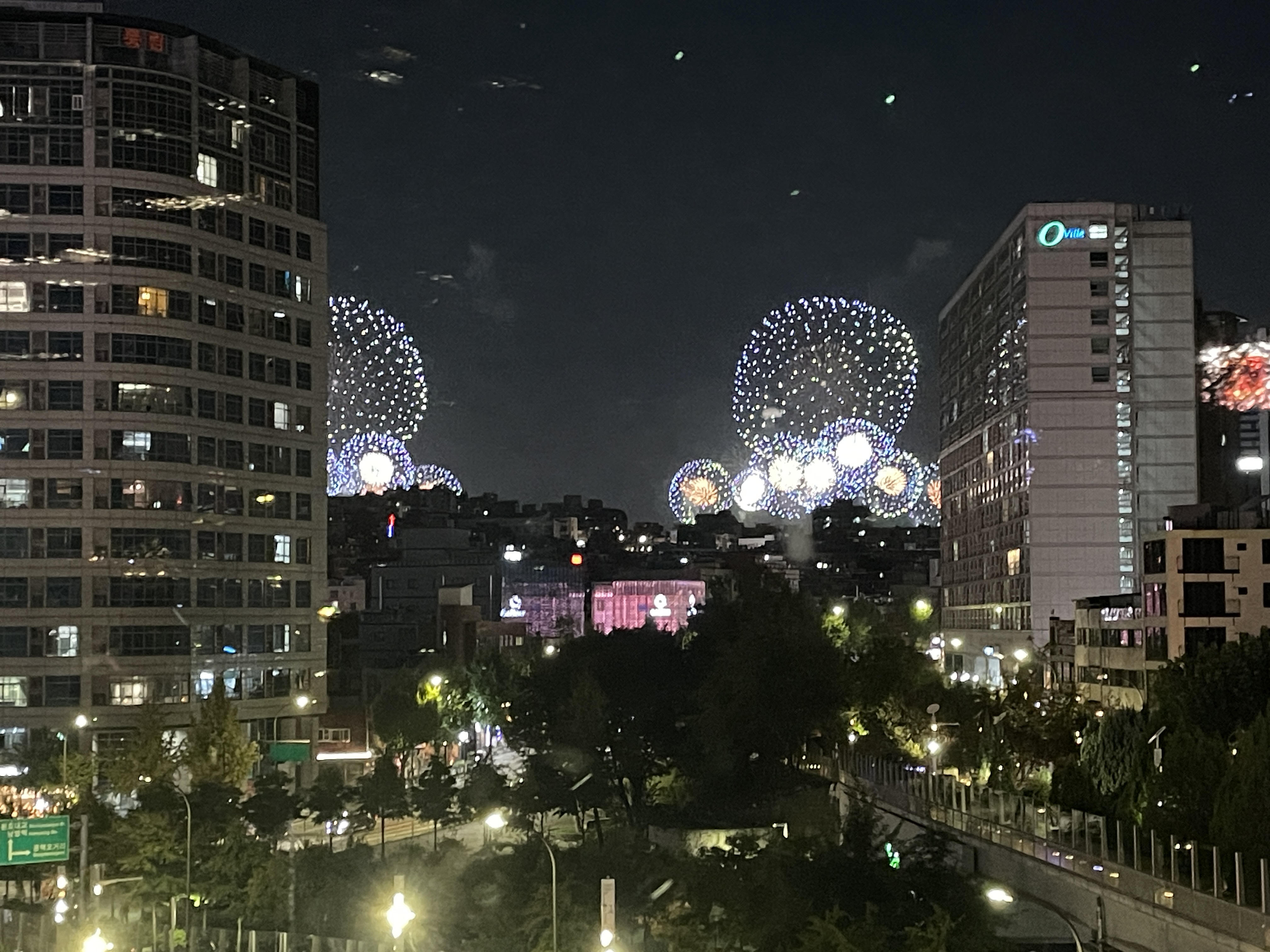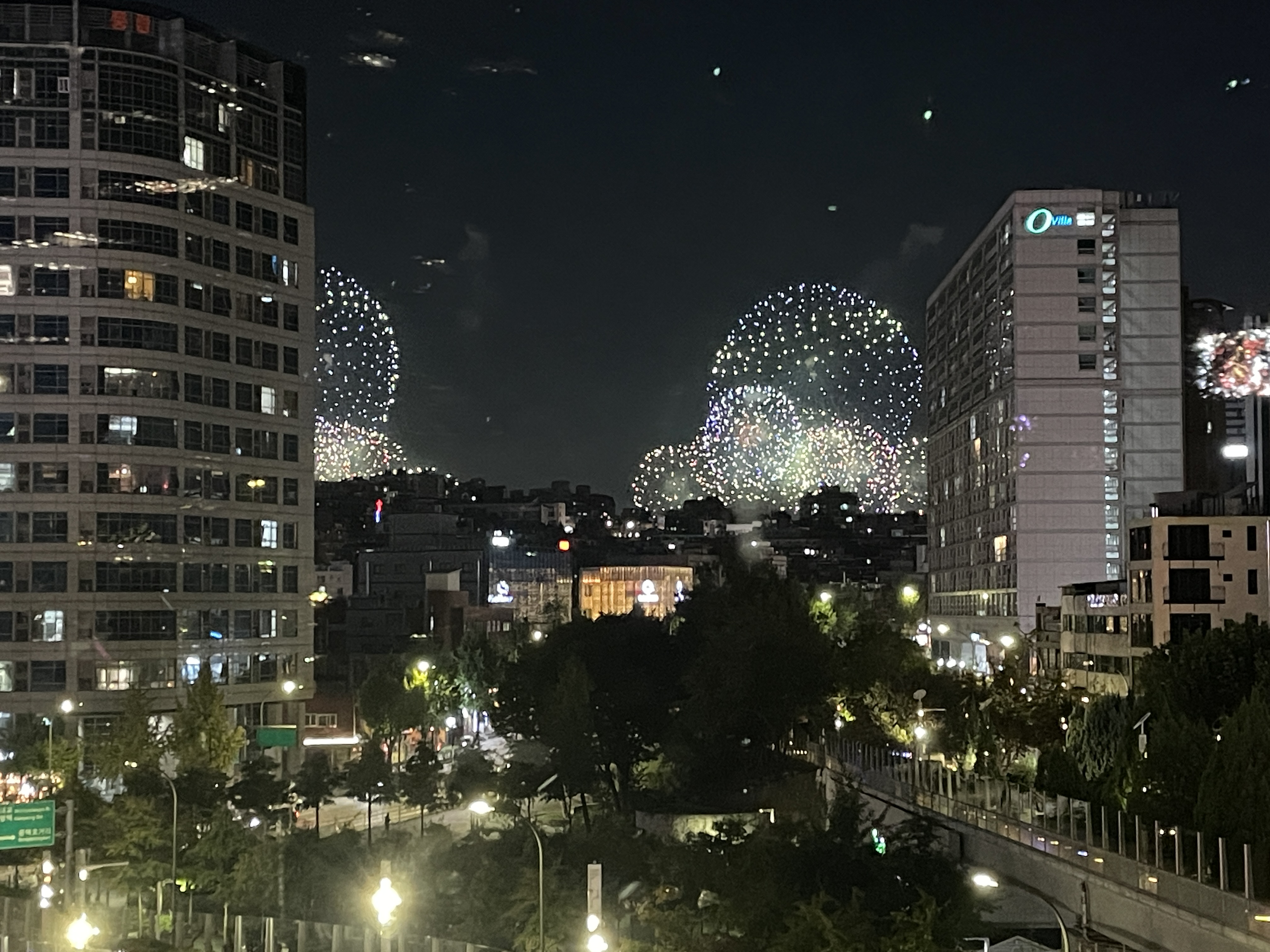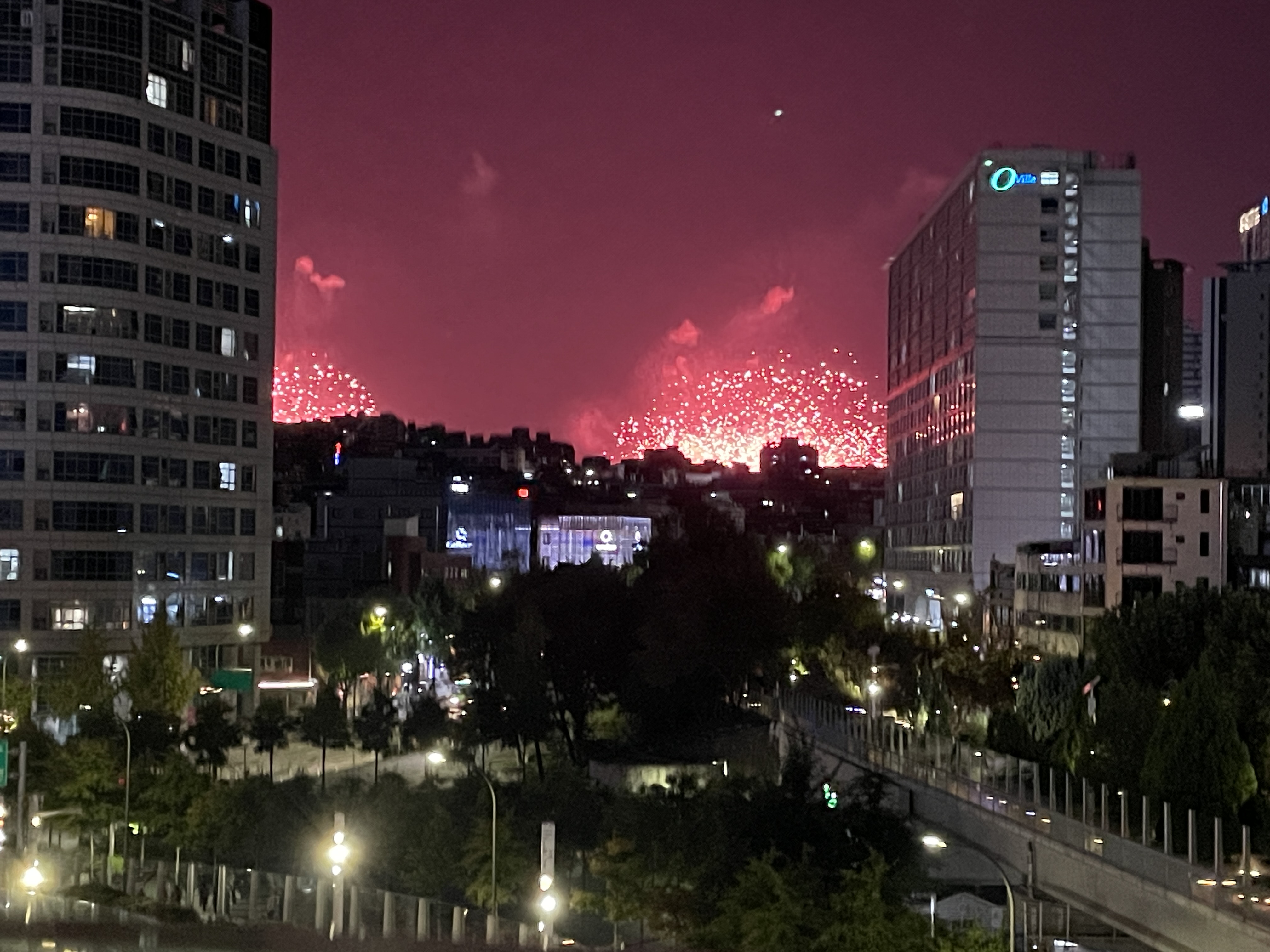 여의도에서 열리는 불꽃놀이를 멀리 떨어진 서울로 7017에서 완벽히 볼 수 있는 것은 아닙니다. 높게 쏘아올린 불꽃들만 간간히 보이는 정도였지만, 그럼에도 불구하고 하늘에 흩어지는 불꽃들의 아름다움은 충분히 느낄 수 있었습니다. 어짜피 휴대폰으로 유튜브 생중계를 함께 보고 있었기 때문에, 전체적인 장면을 놓치지 않고 즐길 수 있었습니다. 현장에서 느껴지는 생동감과 화면을 통해 보는 전체적인 축제 분위기가 어우러져, 나름대로 만족스러운 관람이었습니다.
