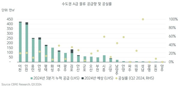 경기도 서북권은 물류센터가 밀집해 있는 지역으로, 이커머스 업체들이 선호하는 장소입니다. 이 지역의 물류 시장은 지속적으로 성장하고 있으며, 공급과 수요의 균형이 맞춰지고 있습니다. 최근 자료에 따르면, 2024년 3분기에는 Grade A 물류 부동산의 공급과 공실률이 안정세를 보일 것으로 예상됩니다.