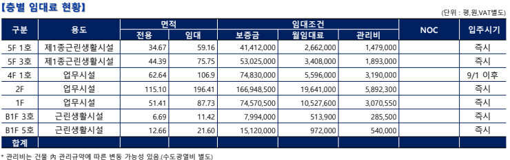 - 주차: 총 74대 (무료 50평당 1대, 유료 월 130,000원/VAT 포함)